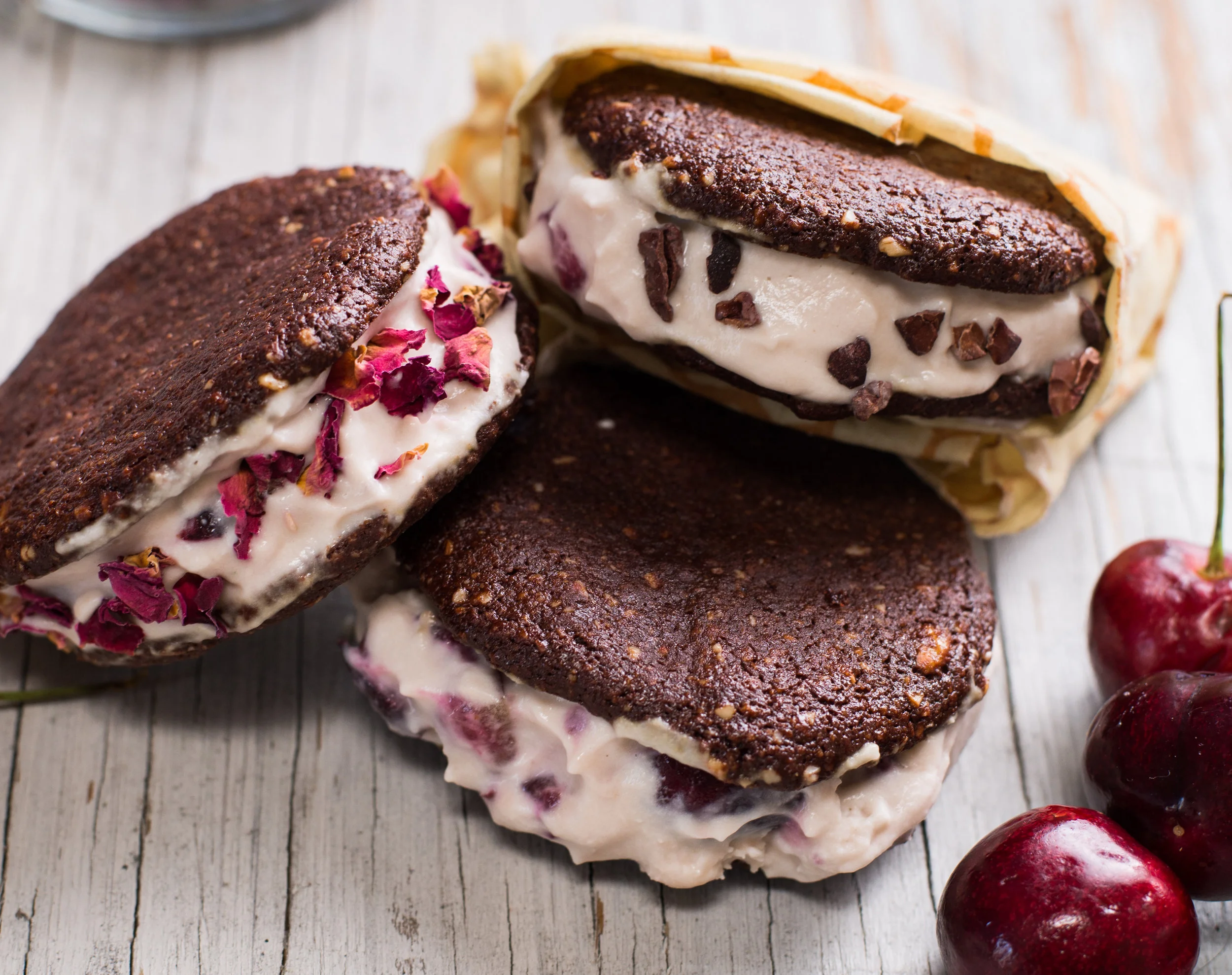 Add a scoop of ice cream to a cookie and top with a second cookie to make a sandwich. Roll in crushed rose petals, chopped walnuts and/or cacao nibs if desired.